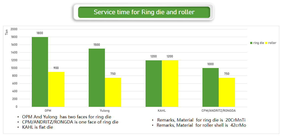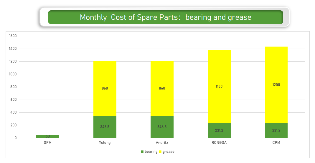 14. Monthly cost of spare parts (bearing/grease), since we do not have consumption of bearing and grease, the operational cost is only the ring die and roller shell oil seal, aramid packing, etc. Only 1/3-1/2 ofthe the other brands. (refer to the bar chart for consumption of bearing/ grease and service time of roller shell/die )